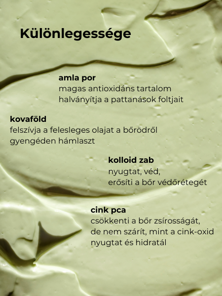 összetevők: zöld agyag, kovaföld, kolloid zabpehely, amla gyümölcspor, spirulina, cink pca